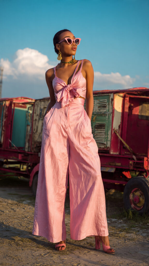 Wide-leg pants in bold pink hit hard in the best way. You keep the top lighter so the pants stay the star.