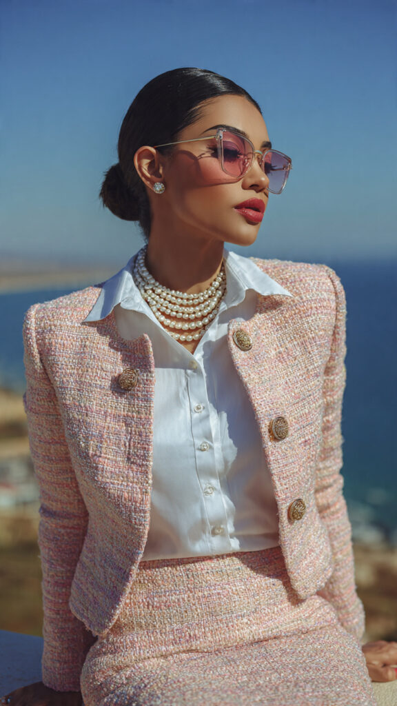 This outfit looks expensive because it relies on structure. A tweed blazer does wonders.