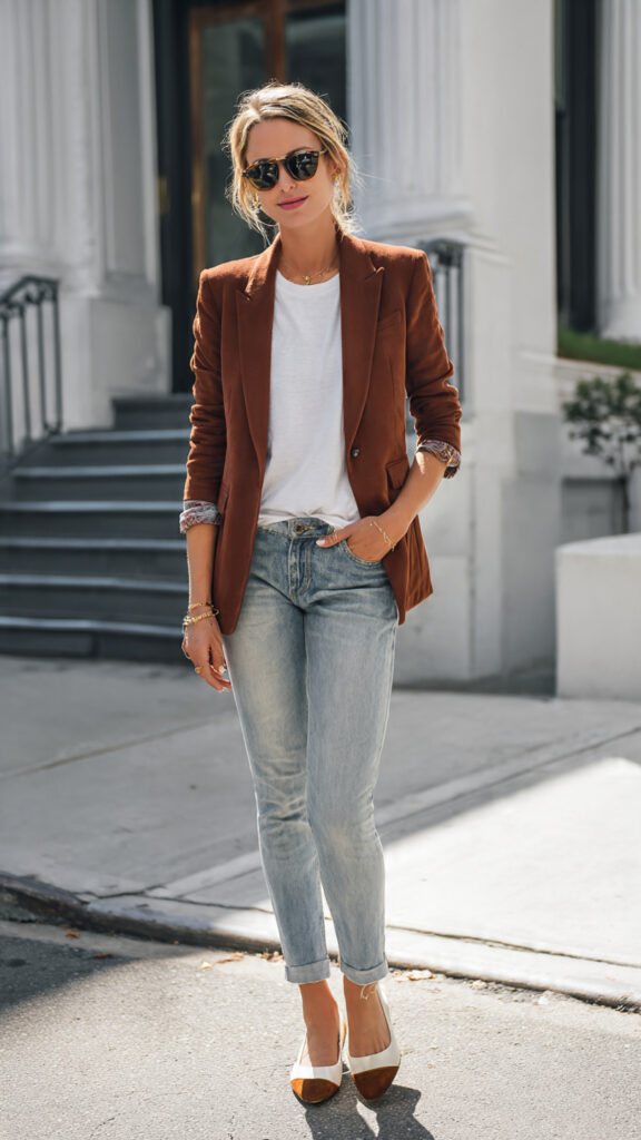 Throw a chocolate-brown blazer over a white tee and light-wash jeans. Finish with two-tone ballet flats and suddenly the outfit feels Parisian instead of weekend-errand-core.