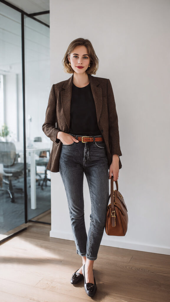 A brown oversized blazer + fitted black top = clean foundation. Add a leather belt, structured bag, and ballet flats and you’ve got a relaxed look that still reads professional.