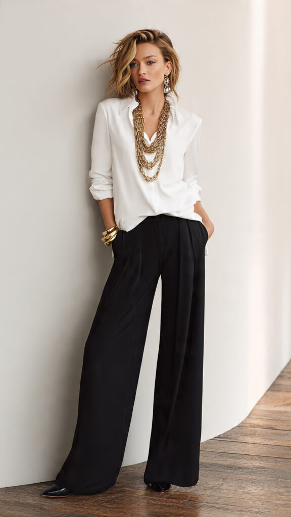 A white button-down tucked into black trousers feels timeless. Drape a long black coat over your shoulders for drama. Add patent loafers and a structured bag and you’ve officially entered main-character-at-work territory.