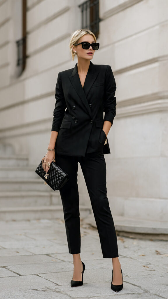 A double-breasted blazer with strong shoulders + tailored trousers = instant authority. Add pointed heels, a quilted clutch, and oversized sunglasses and suddenly you look like you run three departments and a side hustle.