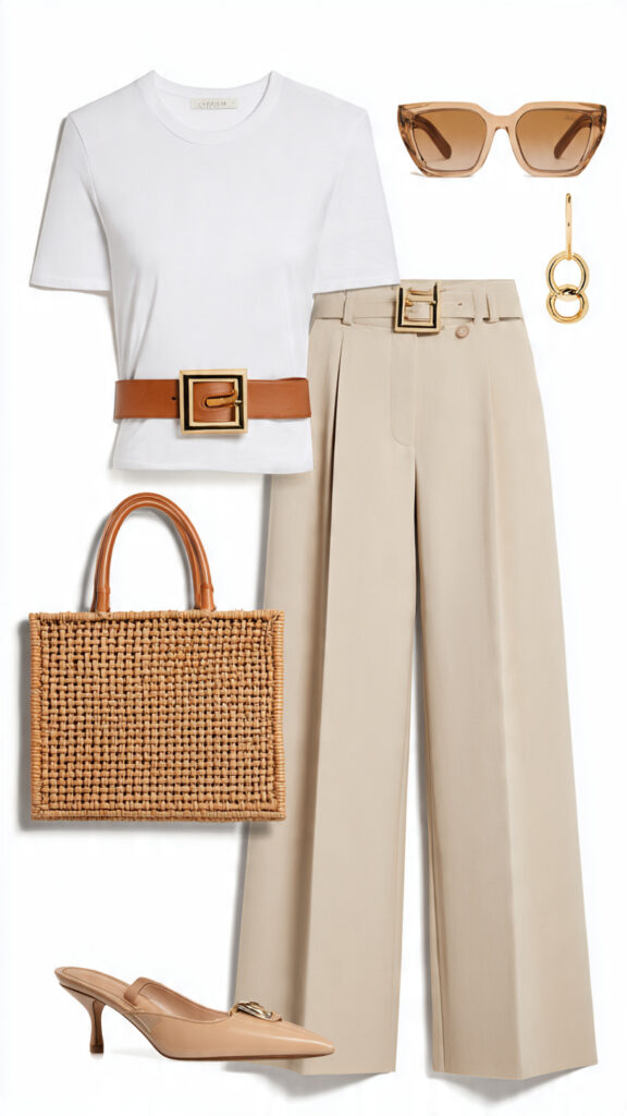 Nothing beats a crisp white tee tucked into beige wide-leg trousers.