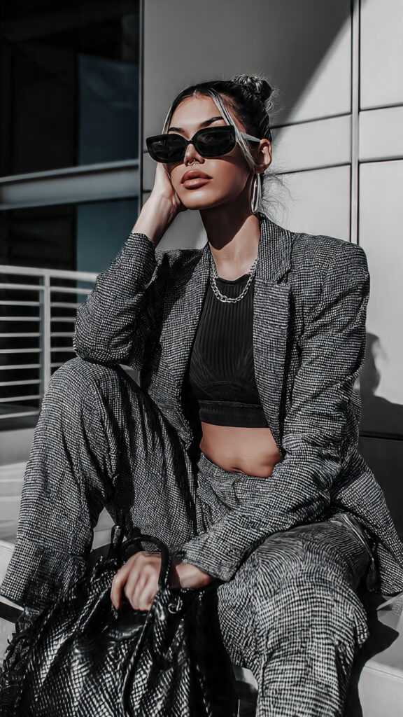 A structured double-breasted blazer with strong shoulders sets the tone right away. Pair it with slightly flared tailored trousers and suddenly you look like you run the meeting.