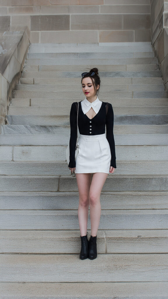 A white button-down tucked into black wide-leg trousers creates instant authority. Toss a longline black coat over your shoulders for drama—because why not?
