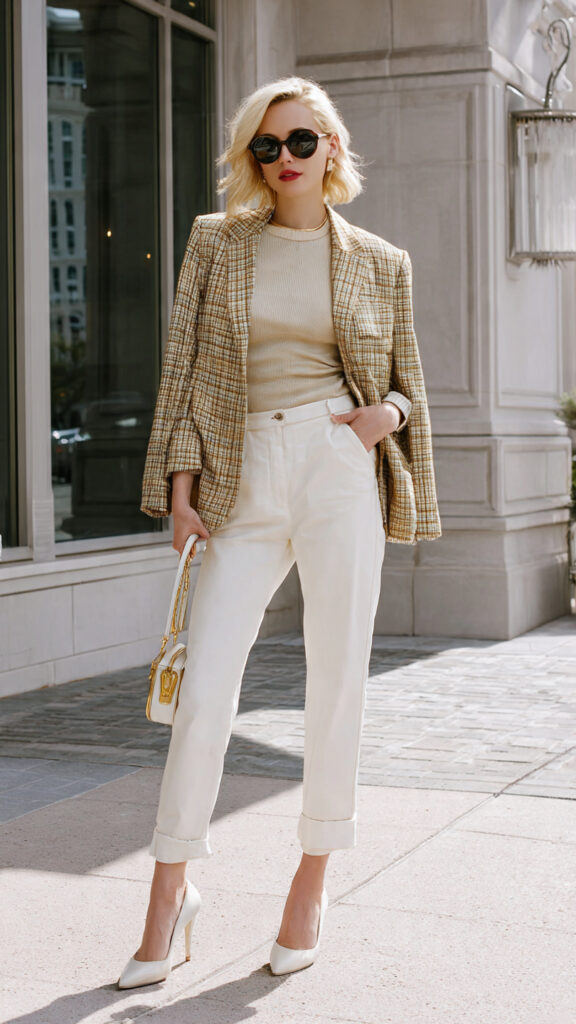 Layer a beige blazer over a textured knit, then anchor the look with wide-leg white trousers. This combo handles unpredictable spring weather like a pro.