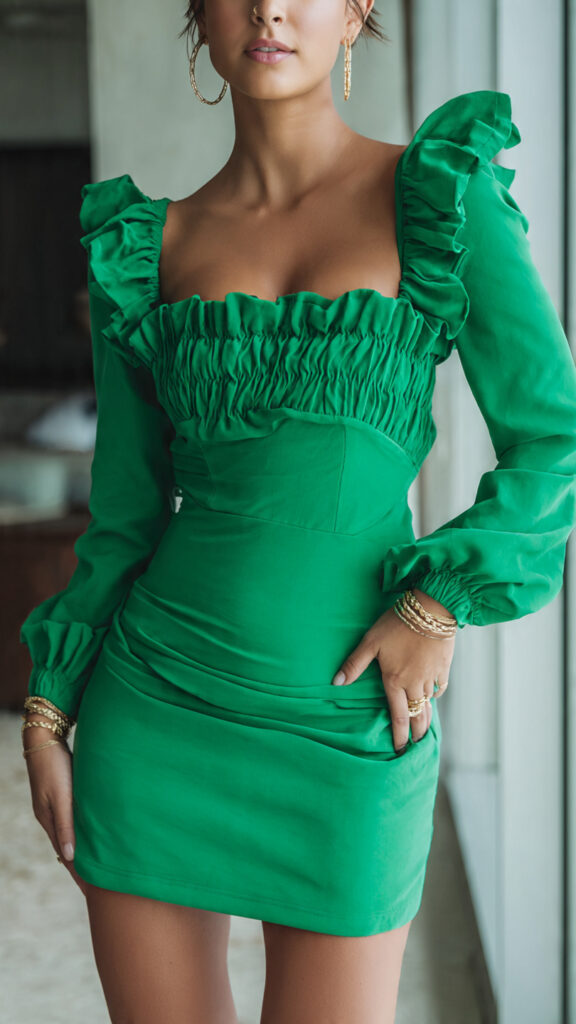 A green mini dress brings fun without trying too hard. I add gold hoops and metallic heels and let the color do the talking.