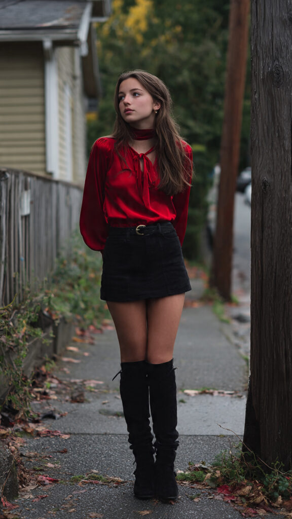 Red Top + Black Mini Skirt + Tall Boots