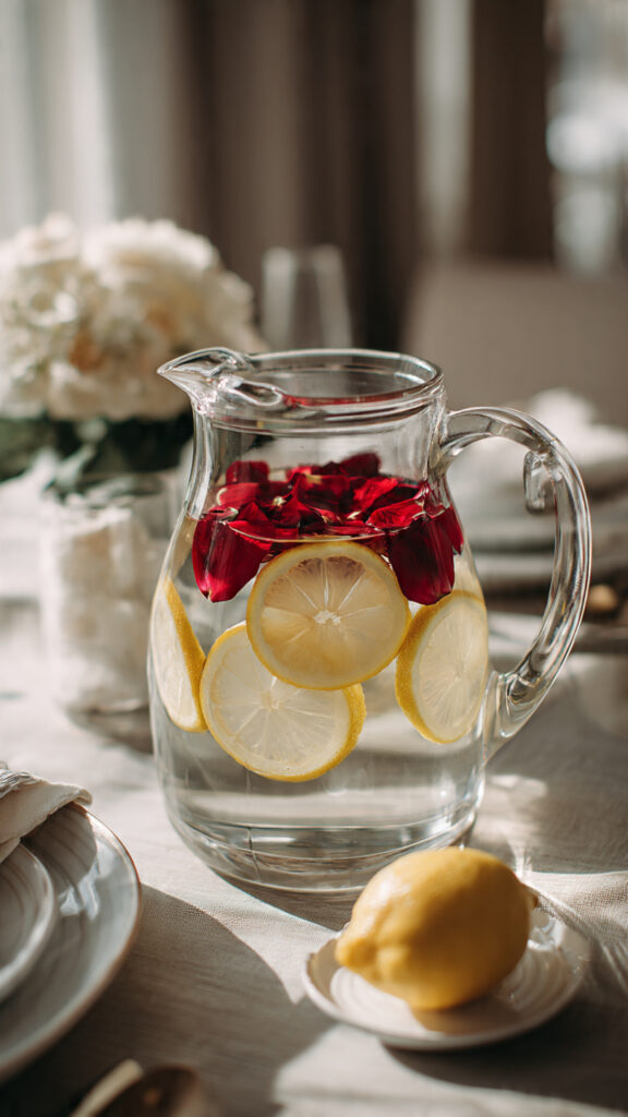 Fill a clear pitcher with water, rose petals, and lemon or cucumber slices.