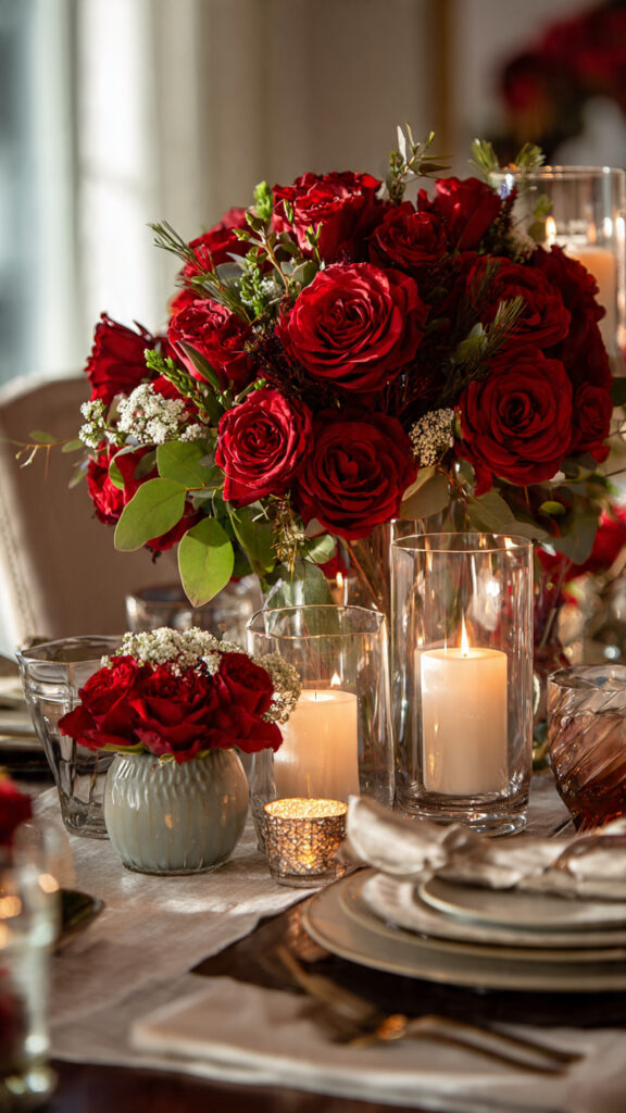 Mix red roses with greenery or white flowers for contrast. Use different heights to keep the table visually interesting and not flat.