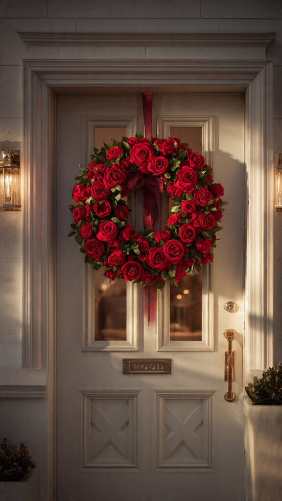 Hang a red rose wreath on your front door or above a mantel. Add ribbon or subtle lights if you want extra drama (the good kind).