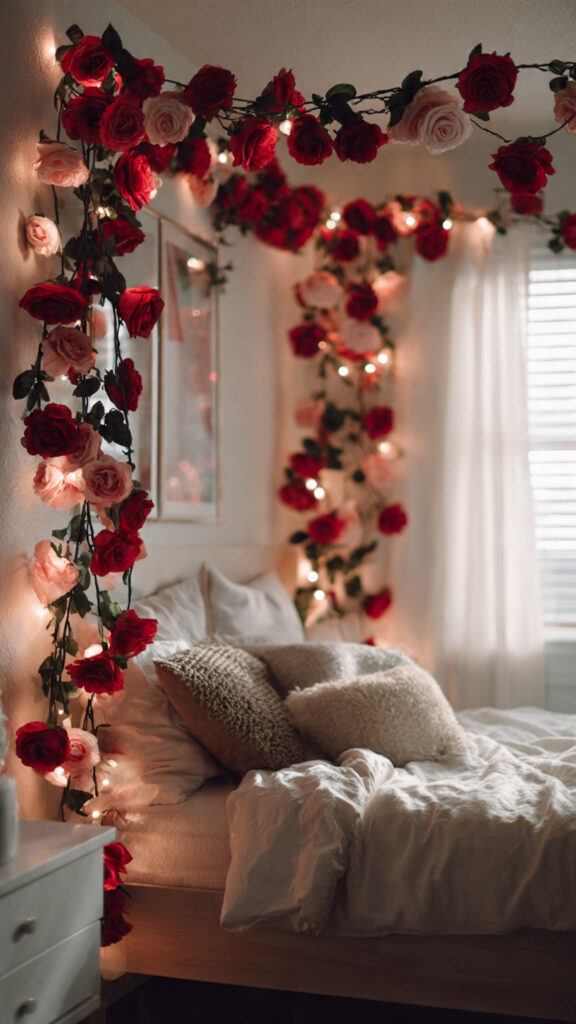 Drape red rose garlands across walls, tables, or stair railings. Mix red with blush for softness or go full crimson for drama.