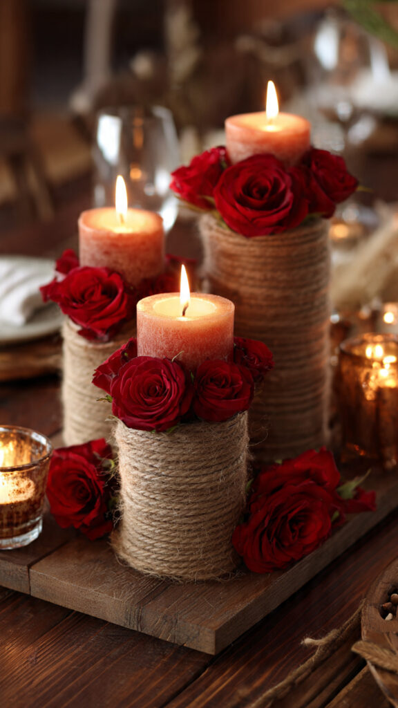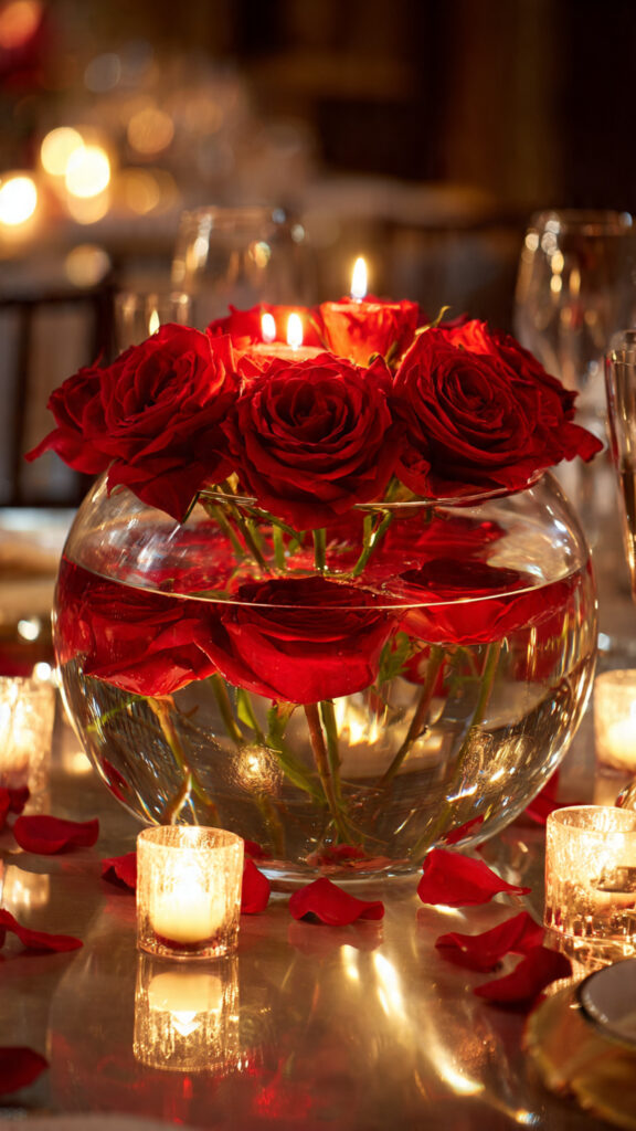 Float red roses in a clear glass bowl filled with water. Surround it with tea lights for reflection and glow. It’s elegant, romantic, and surprisingly easy.