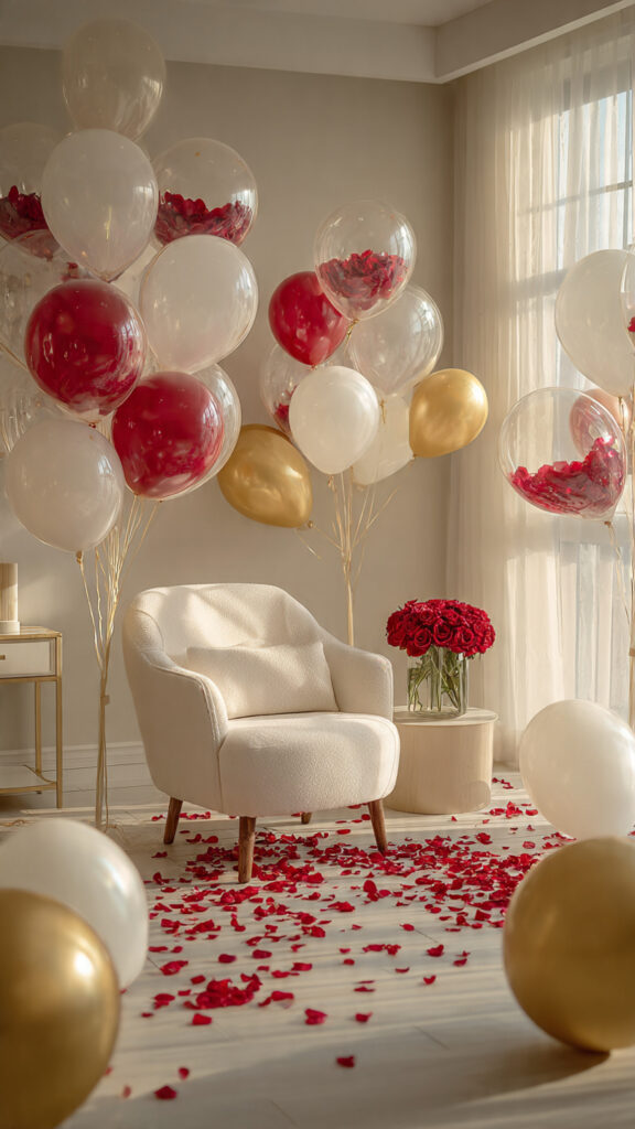 Clear balloons filled with red rose petals look playful and elegant.