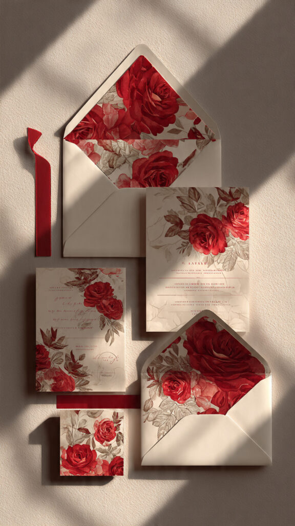 Use rose imagery, floral patterns, or laser-cut designs. Tie invitations with ribbon for an extra romantic touch.
