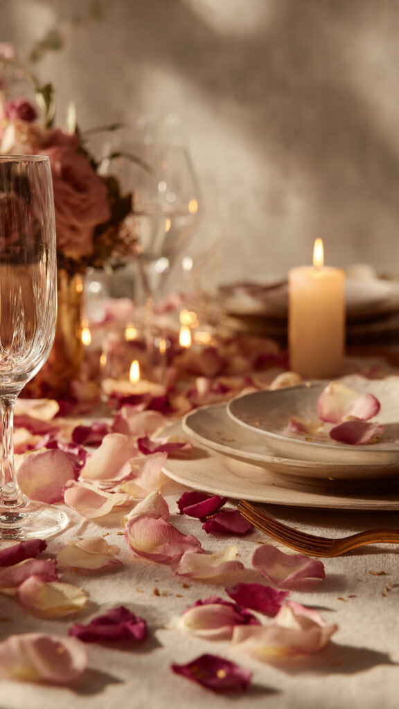 Lay petals over fabric or create a full faux-rose runner. Add candles and greenery so it feels lush, not overwhelming.