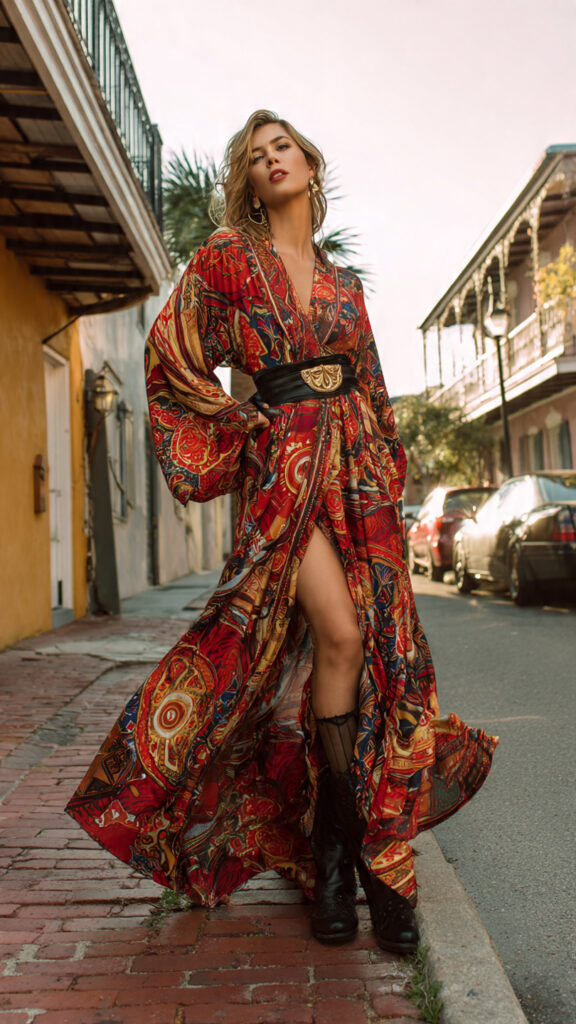 A bold kaftan is underrated Mardi Gras gold. It’s comfortable, dramatic, and perfect for all-day wear.
