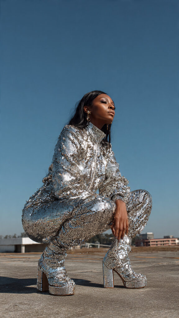 A fully sequined or mirrored jumpsuit is fearless—and very Mardi Gras. It’s dramatic without being impractical, which is rare.