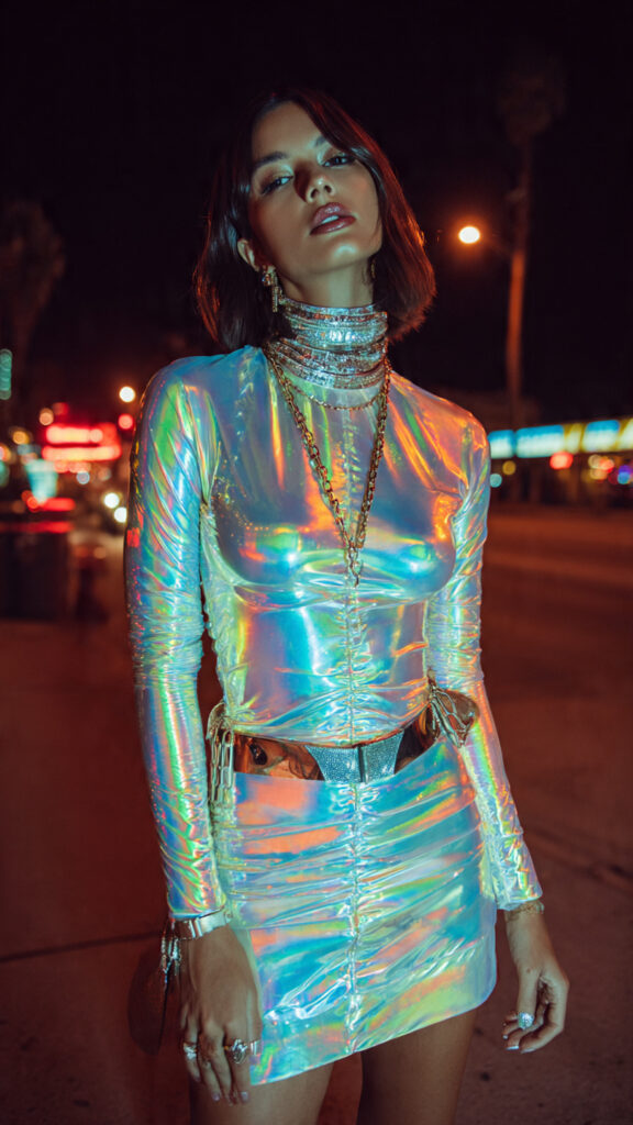 Holographic fabric hits different at night. A holographic mini dress or co-ord set reflects purple, green, and gold all at once, which feels very on-theme without trying.