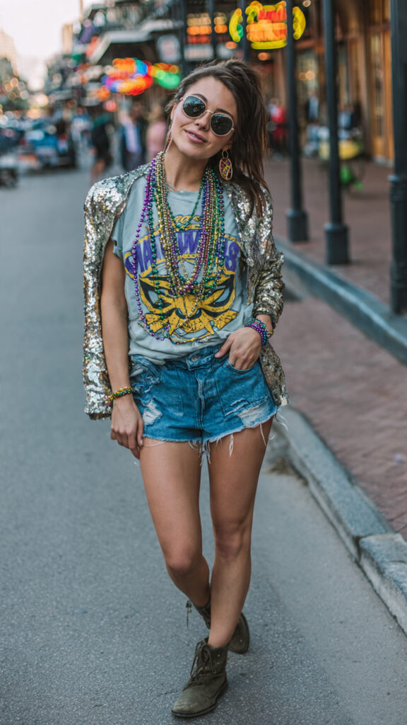 Yes, you can go casual and still be festive. A Mardi Gras tee with denim becomes outfit-worthy when you add sequins, beads, or a metallic jacket.