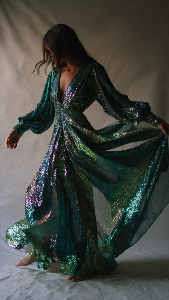 Iridescent sequins in green, teal, or purple give a mermaid-meets-carnival effect that feels magical without being cheesy.
