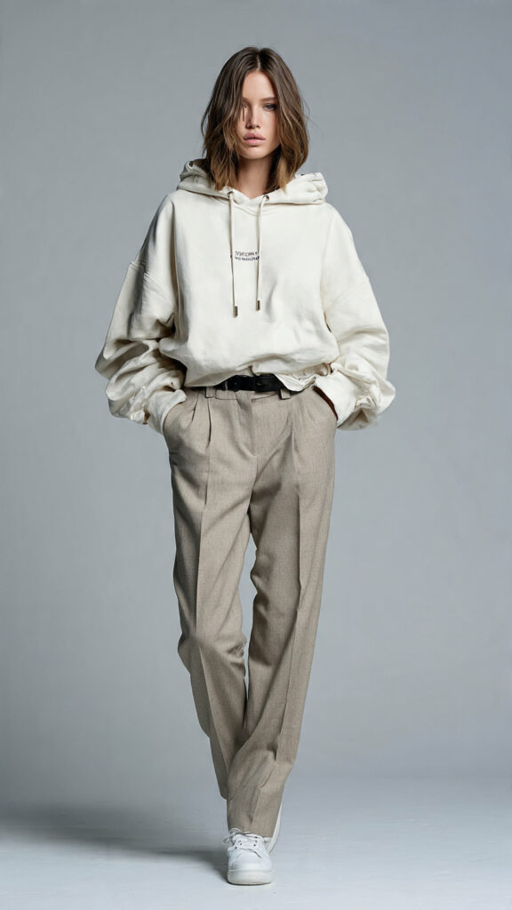 A clean hoodie paired with tailored pants balances casual and polished.