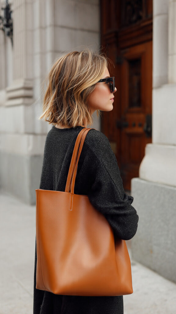A structured leather tote upgrades even the simplest outfit.