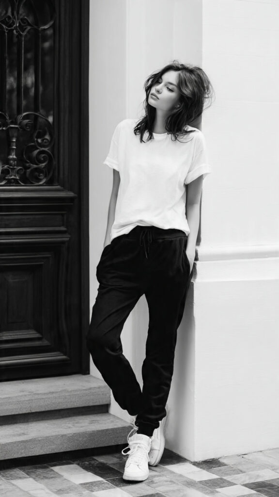 A crisp white tee with black pants stays timeless.