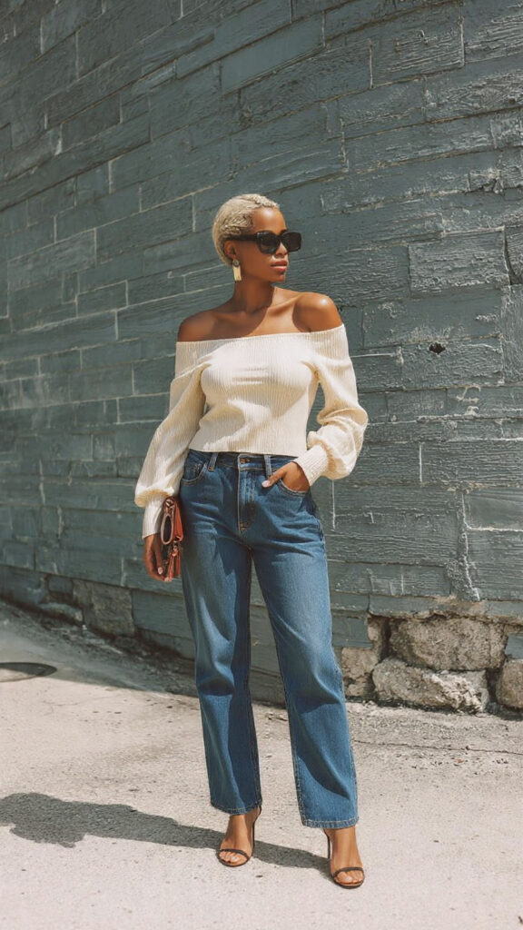 28. Off-Shoulder Knit + Straight Jeans