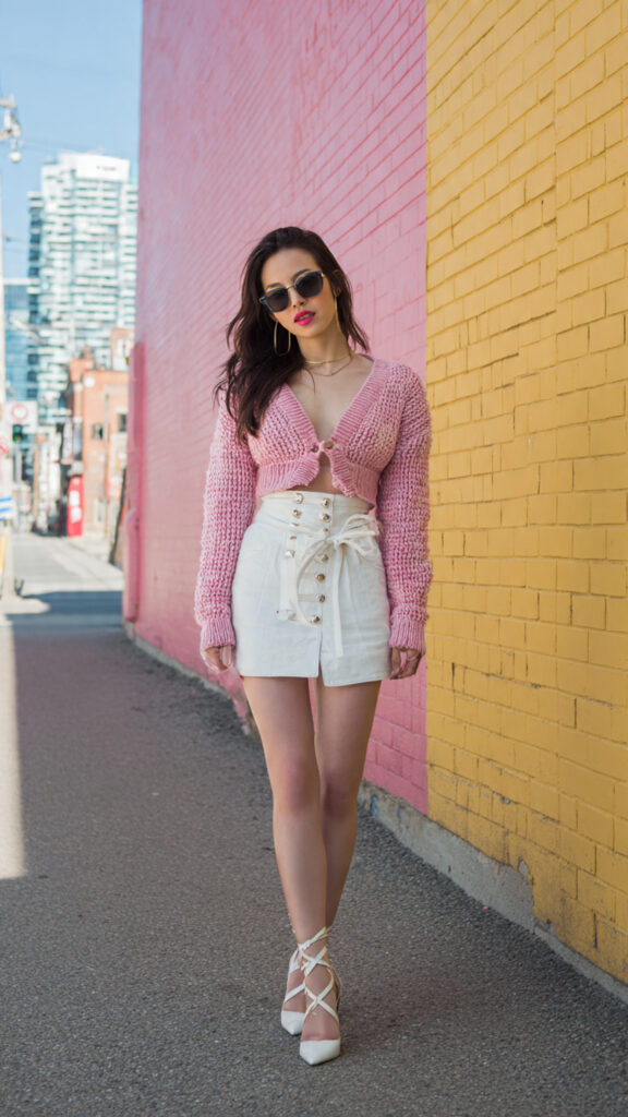 25. Pink Cardigan + White Mini
