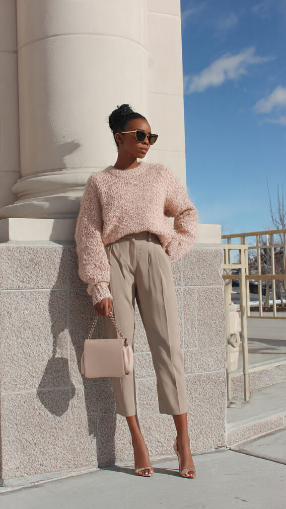Soft pink knits with neutral trousers = cozy perfection. Ideal for coffee dates or casual strolls.