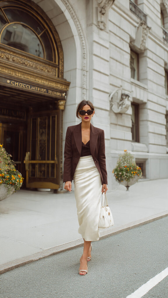 15. Chocolate Blazer + Cream Maxi Skirt