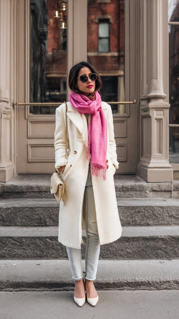 18. Cream Coat + Pink Scarf + Light Jeans