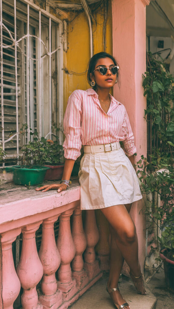 Preppy, romantic, and very wearable. A striped shirt balances out pink tones so the outfit doesn’t feel costume-y.