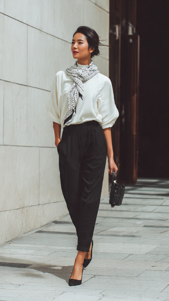 14. White Scarf-Detail Top + Black Trousers