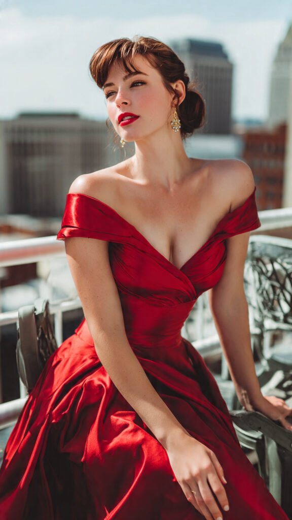 Silk plus red equals instant luxury. A ruby silk off-shoulder dress feels rich without extra effort.
