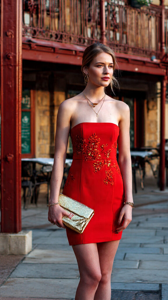 Accessories matter. A gold clutch with an all-red outfit adds contrast without distraction.