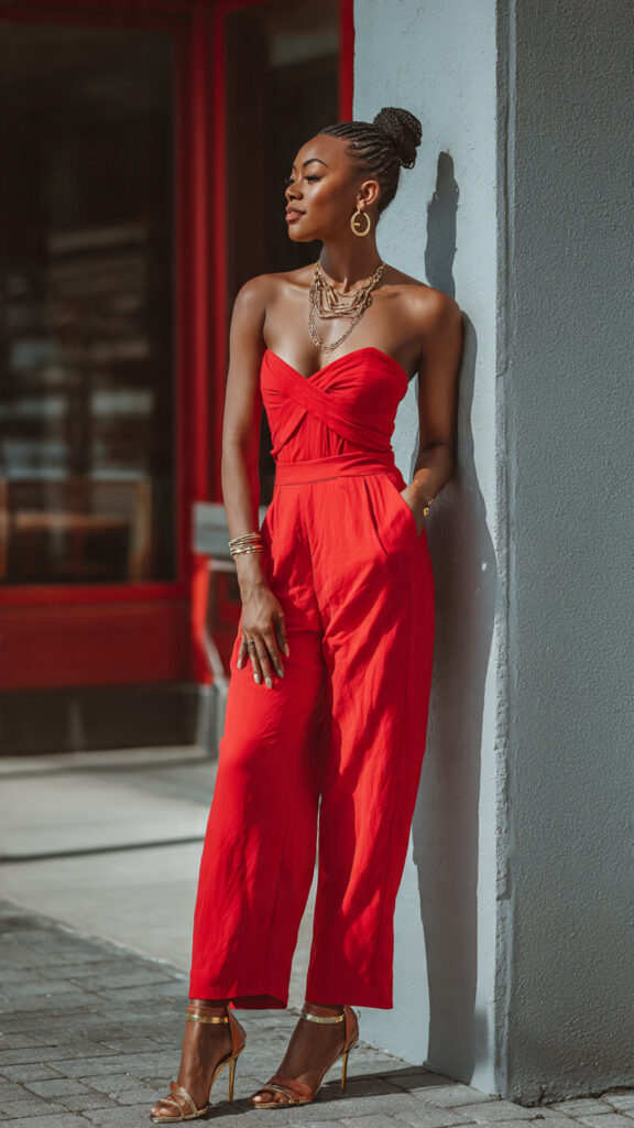 One-shoulder cuts add instant interest. A scarlet one-shoulder jumpsuit feels editorial and modern.