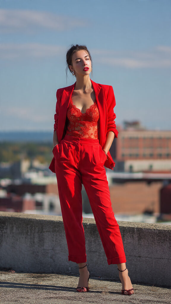 13. Red Blazer + Matching Trousers (Crimson) + Heels