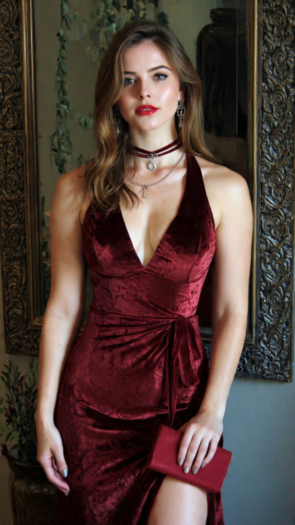 Halter necklines elongate the torso instantly. A ruby satin halter dress feels old-Hollywood in the best way.