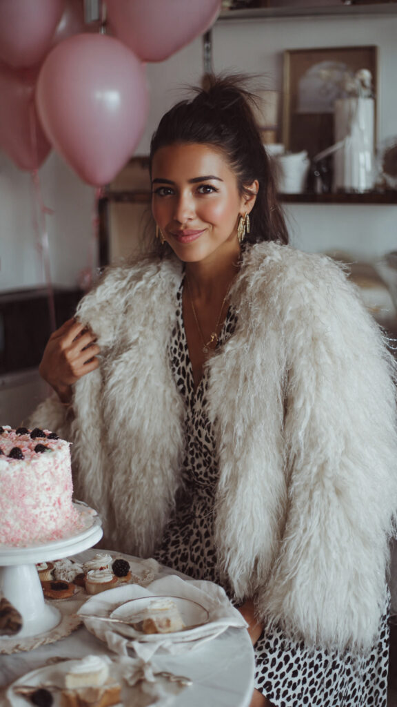 | 6 | Faux fur jacket + simple dress | Birthday girl | Black, ivory | Drama + warmth |