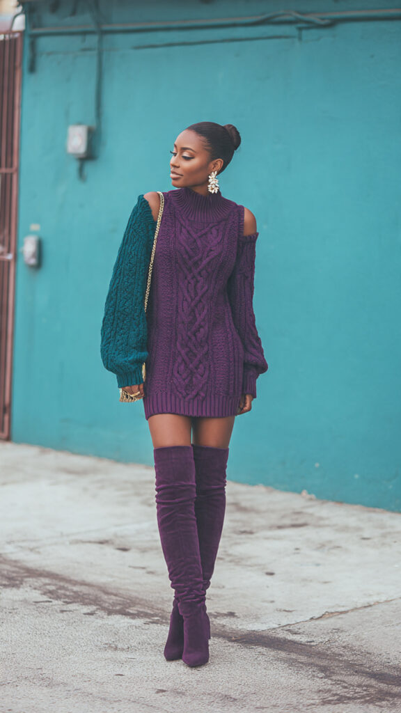 1. Jewel-Tone Knit Dress + Knee-High Boots