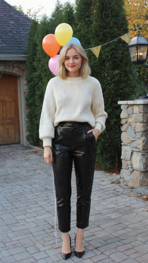 This outfit never misses. Leather or faux leather pants add edge, while a soft knit keeps things balanced.