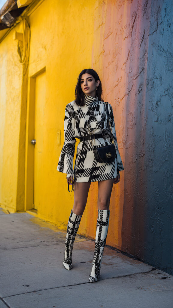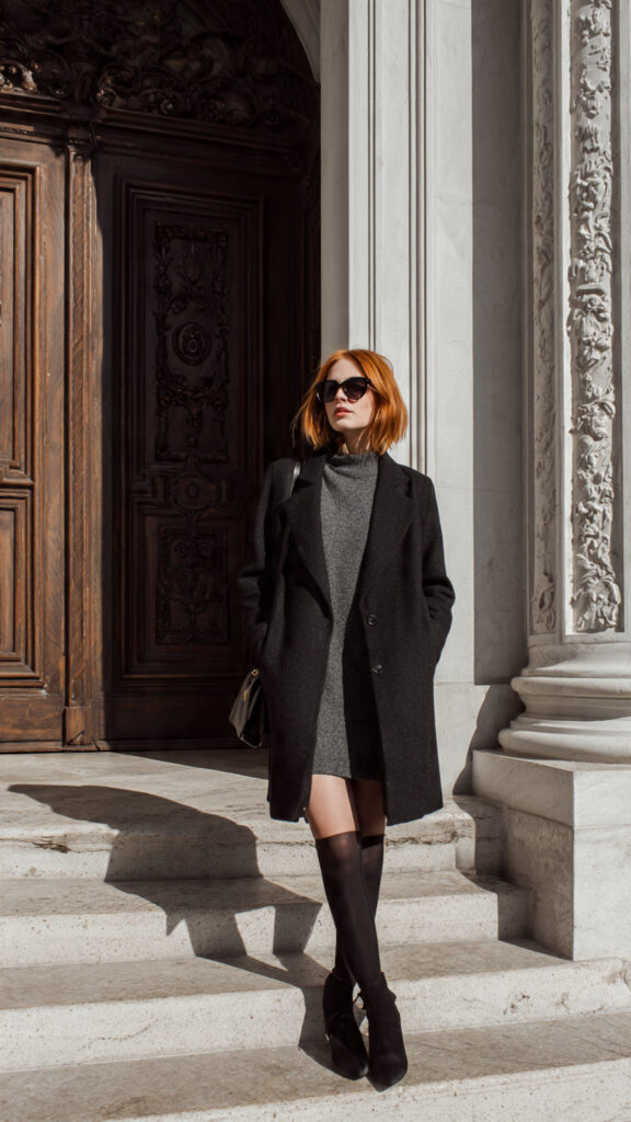 Add knee-high boots for drama and balance. Skip flimsy fabrics ribbed or wool-blend knits photograph better and feel more expensive. People love this look because it’s one piece, zero stress, maximum impact.