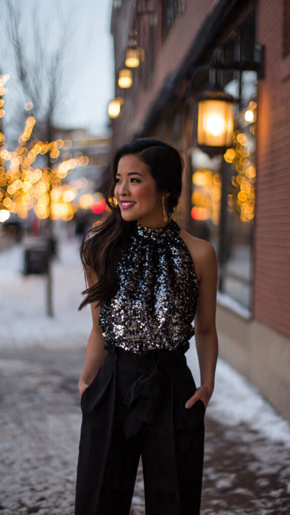 Sequins but make them chill. A sparkly top with tailored black or charcoal pants feels party-ready without chaos.