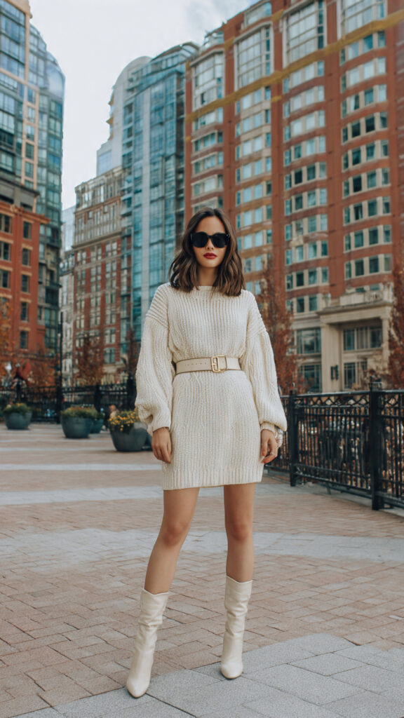 | 15 | Sweater dress + belt | Both | Neutral winter tones | Easy shape definition |