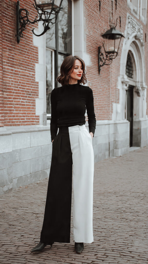 Wide-leg trousers feel elevated and comfortable. Pair with a fitted knit or bodysuit to balance proportions.