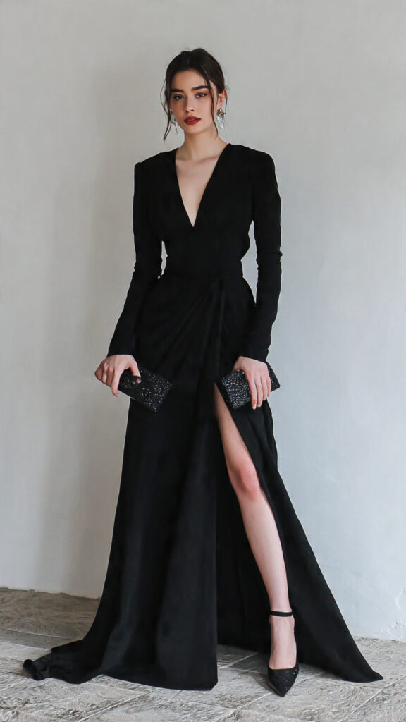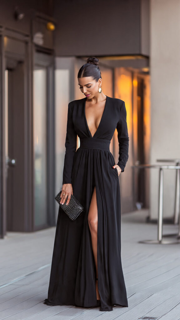 21) Deep V-Neck Long Dress + Clutch