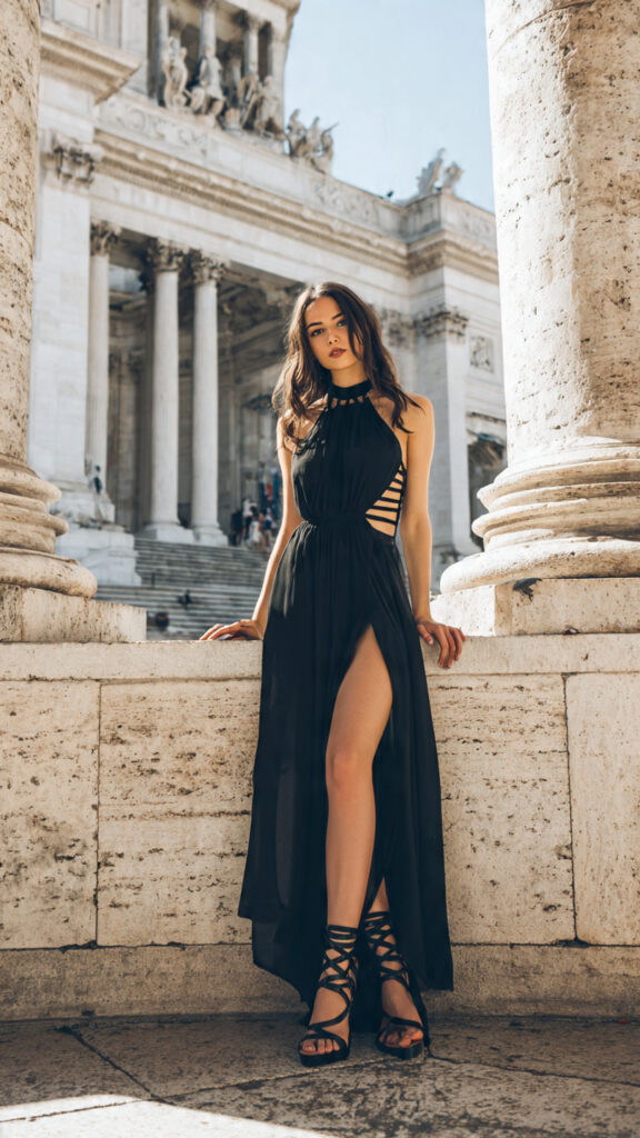 17) Elegant Long Dress + Gladiator Platforms
