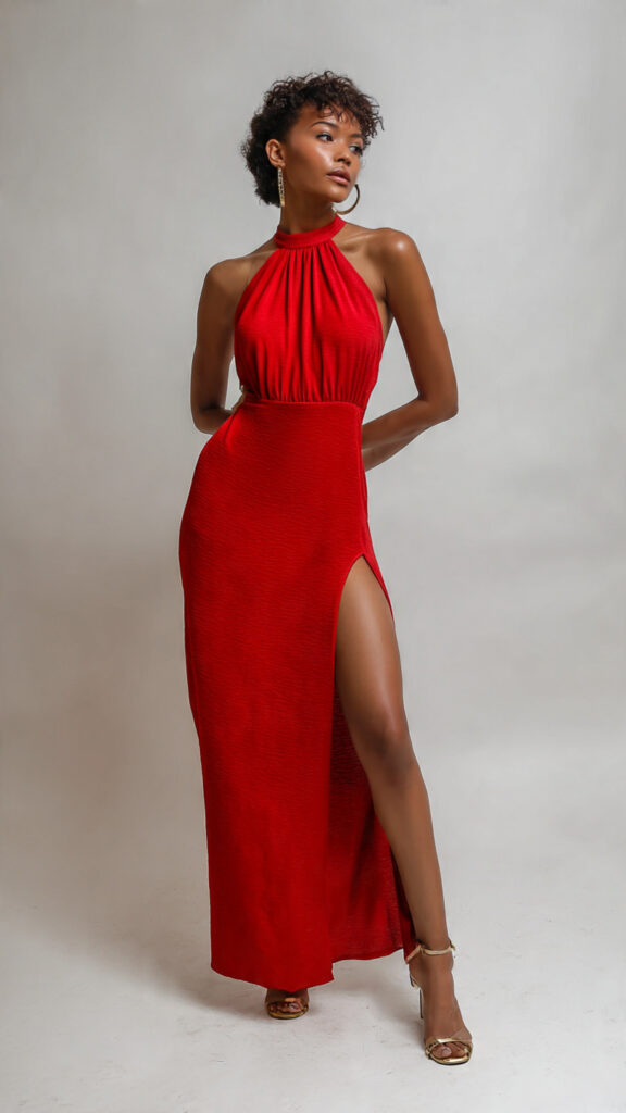 7) Halter-Neck Long Slit Dress + Open-Toe Heels